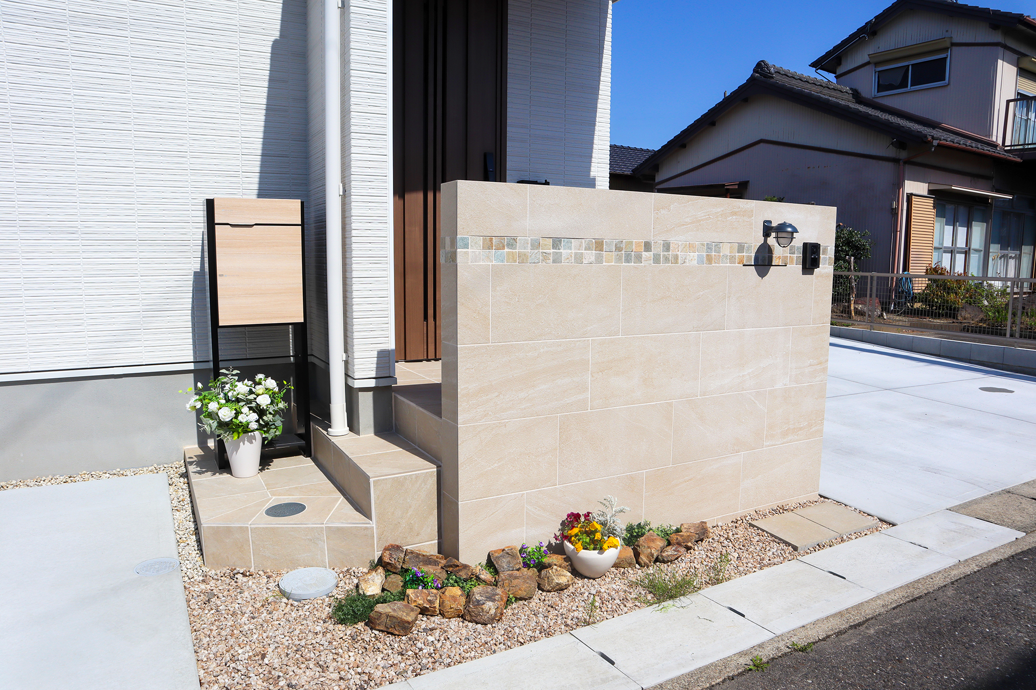 大谷石調タイルを貼った門柱のクローズエクステリア