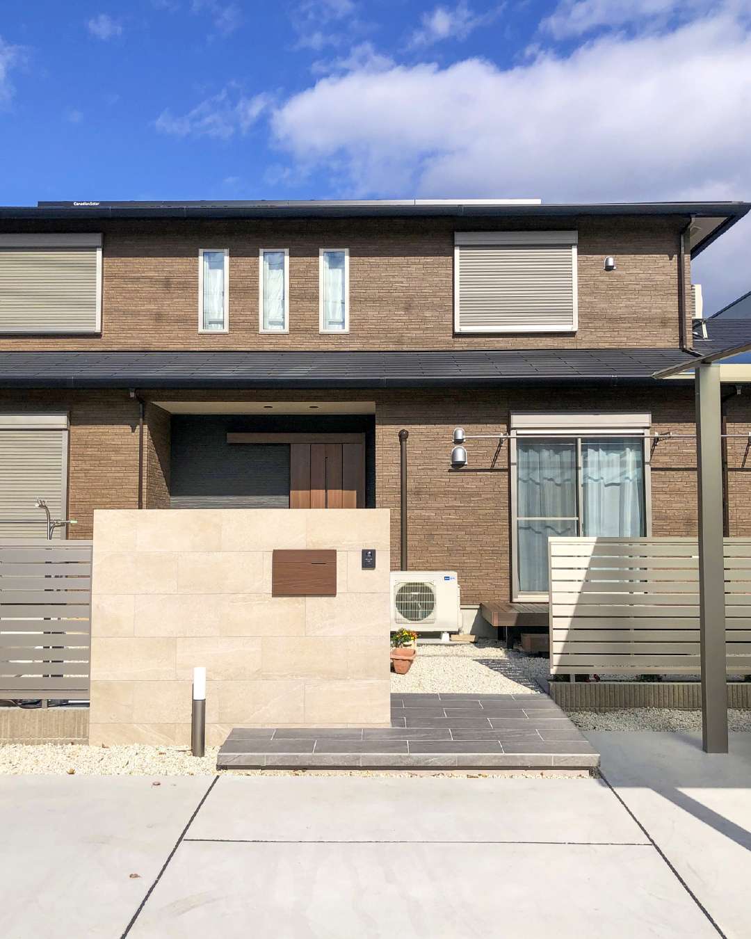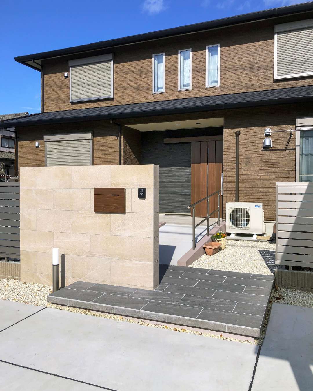 タイルの質感がやさしく映える落ち着いた玄関まわり。建物アクセントカラーと合わせました。