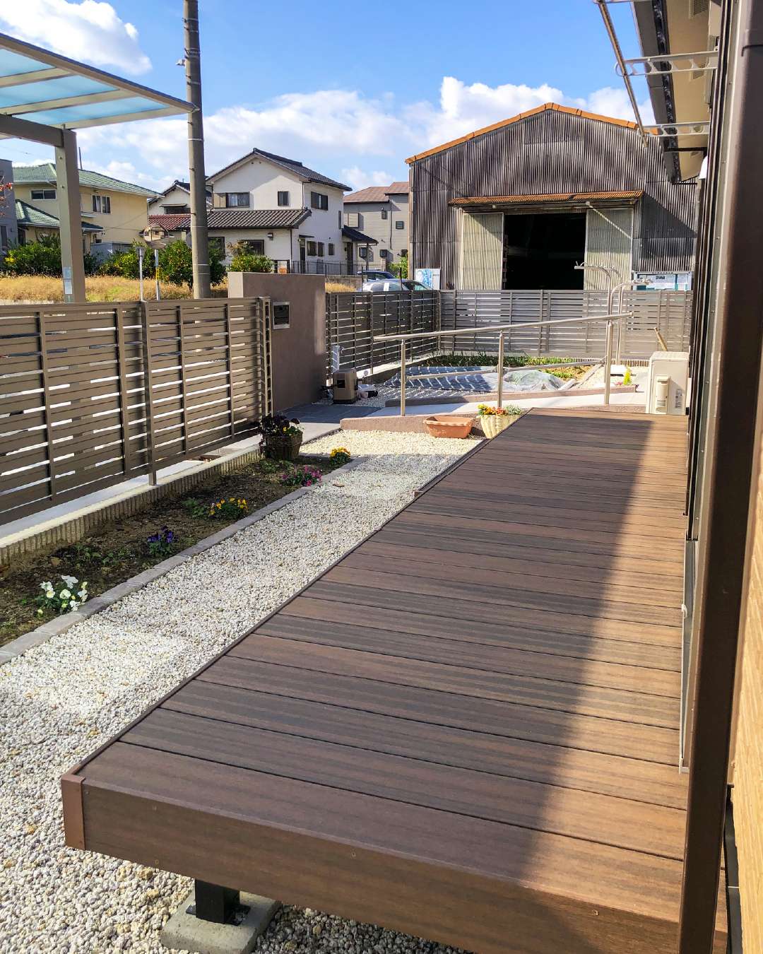 リビングから木調デッキへ続く開放的な庭の外空間。
