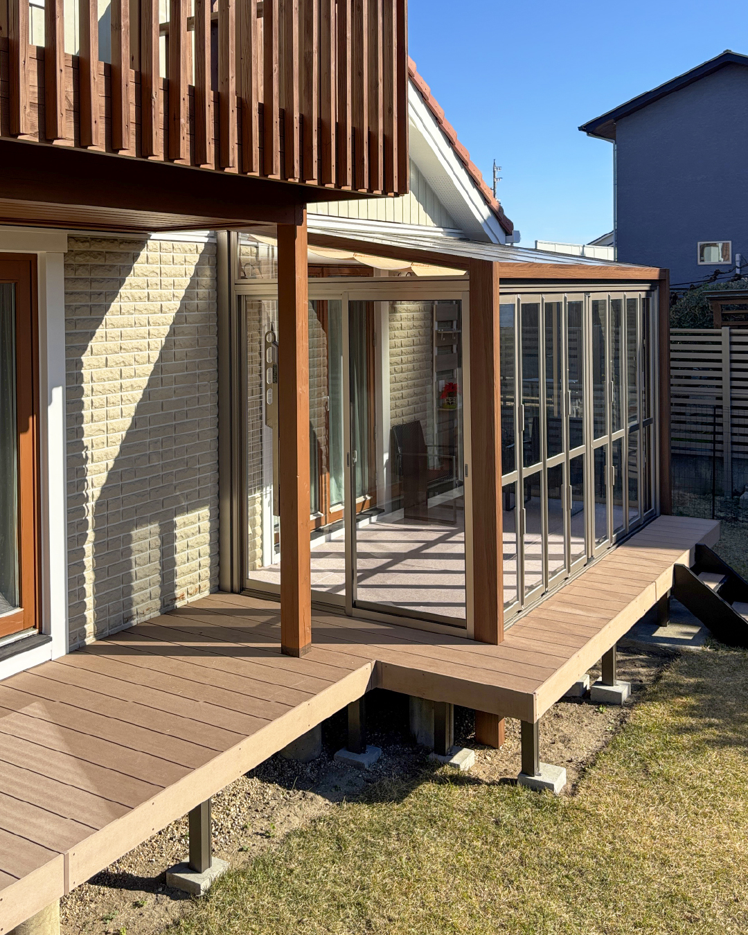木調フレームとデッキが織りなす、光あふれる開放的な空間