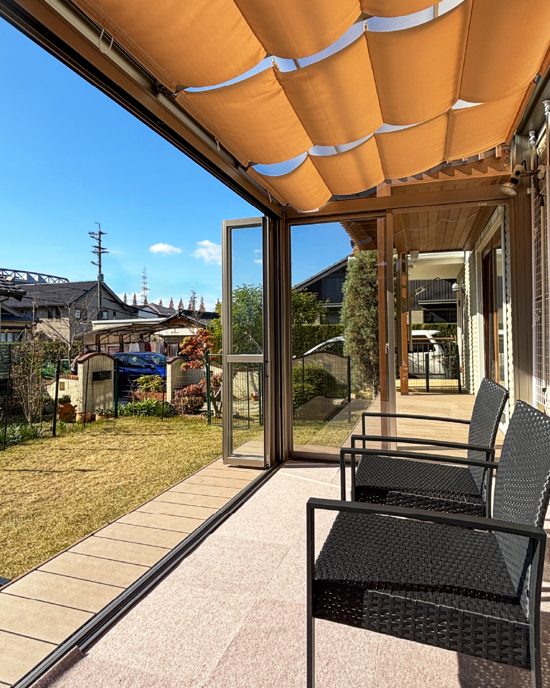 折り戸を開けて庭へつながる心地よさ、日除けが織りなすやわらかな光