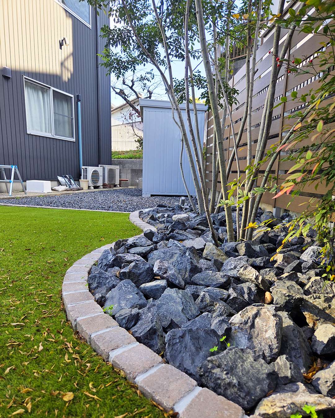 もともとある植栽を主役にお庭をリフォーム。レンガの縁取りで曲線を描きました。