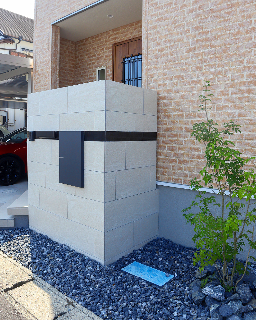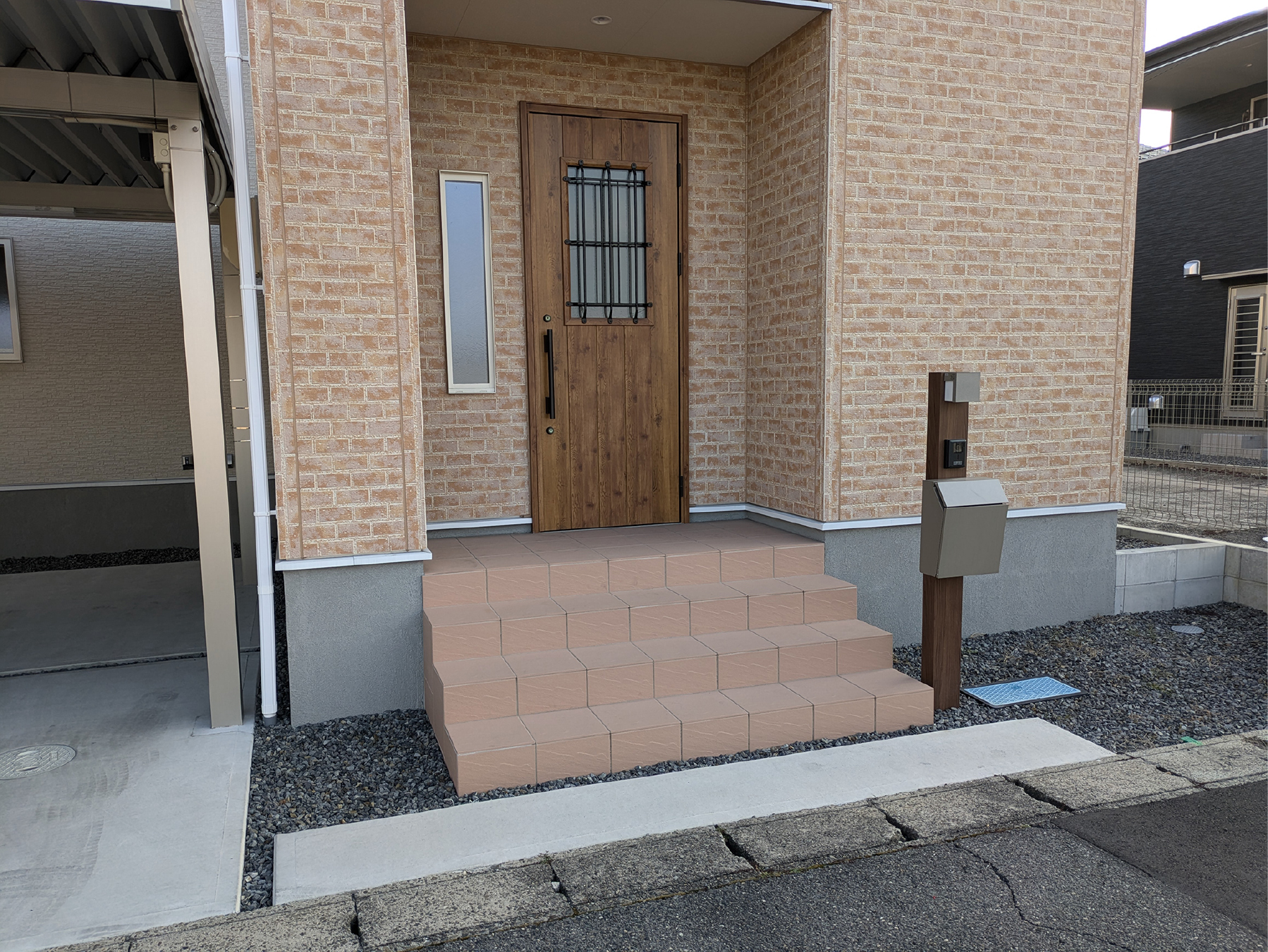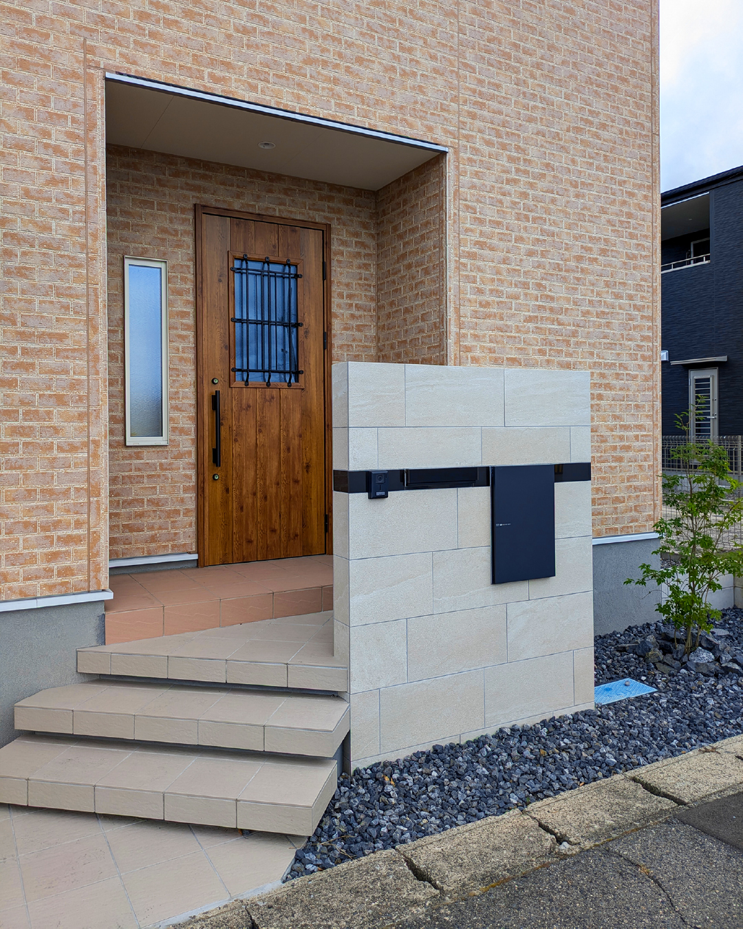 明るいベージュタイル門柱とフロートステップへのリフォーム