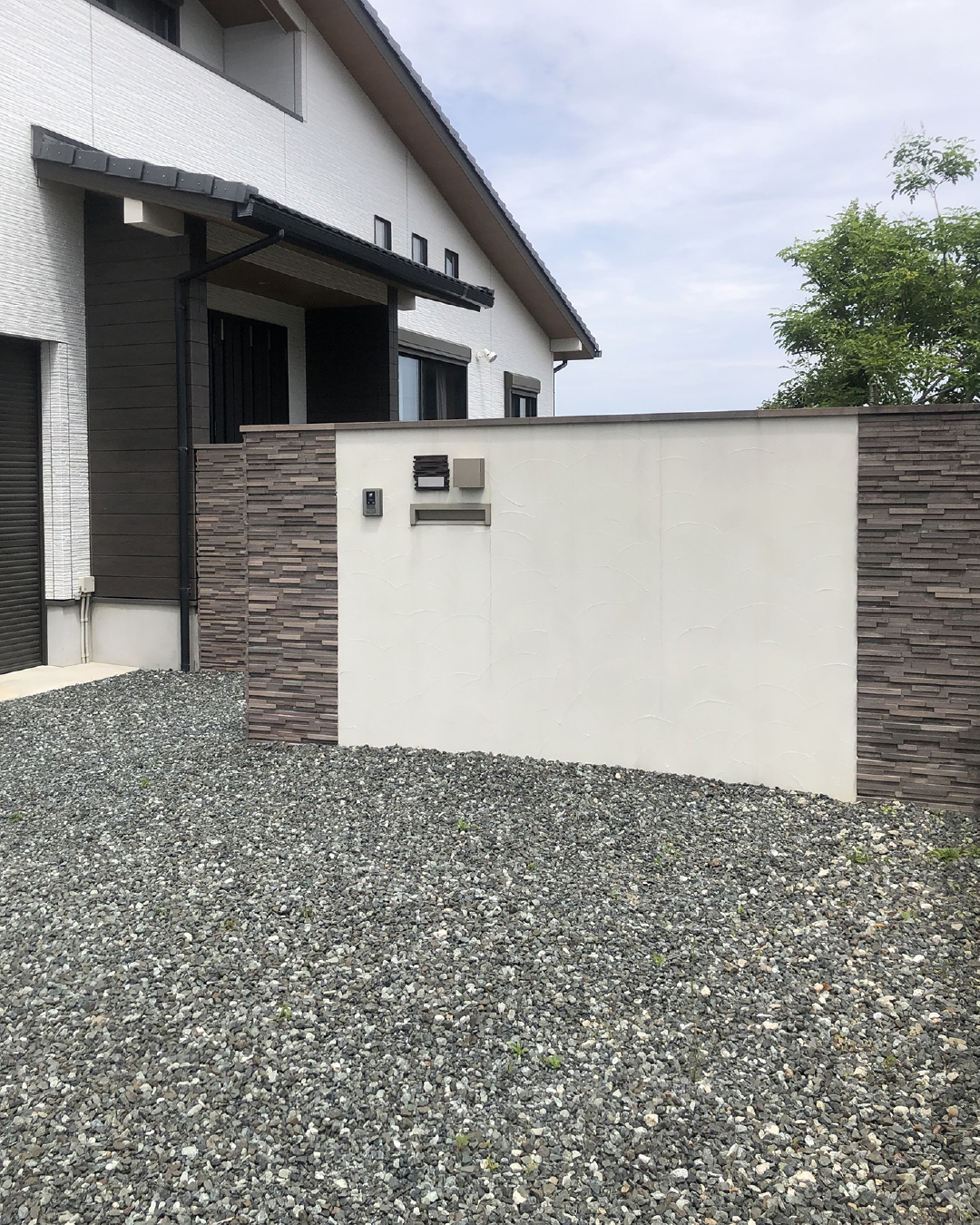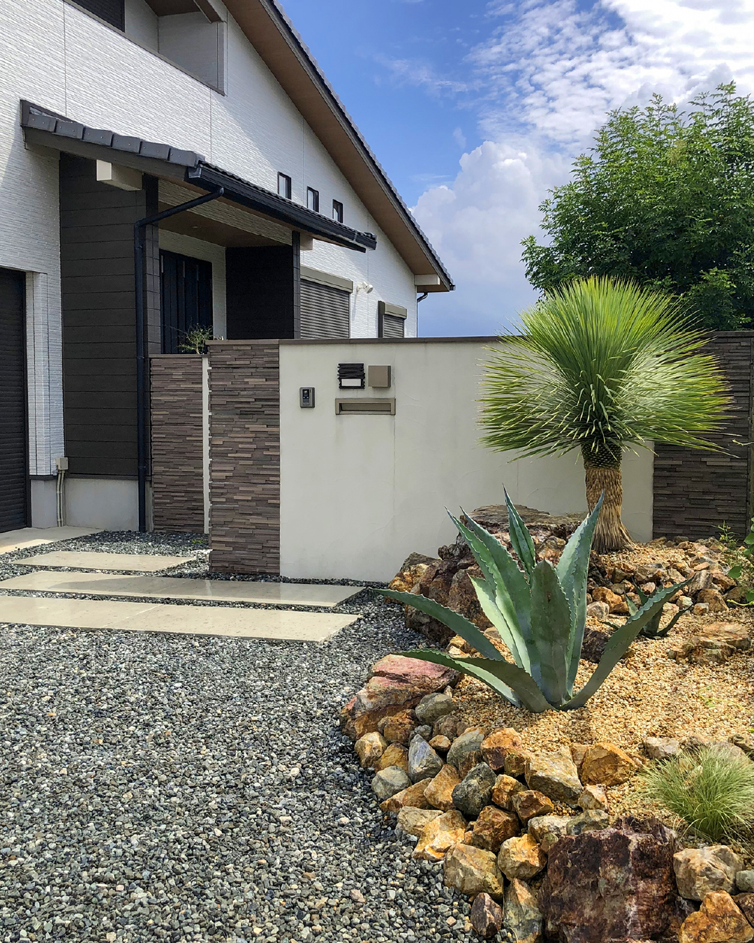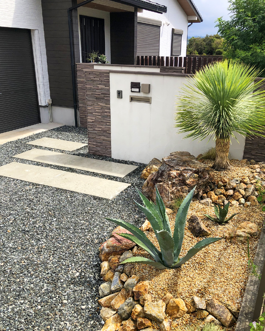 大小の石と砕石が織りなす、力強く個性豊かなお庭。
