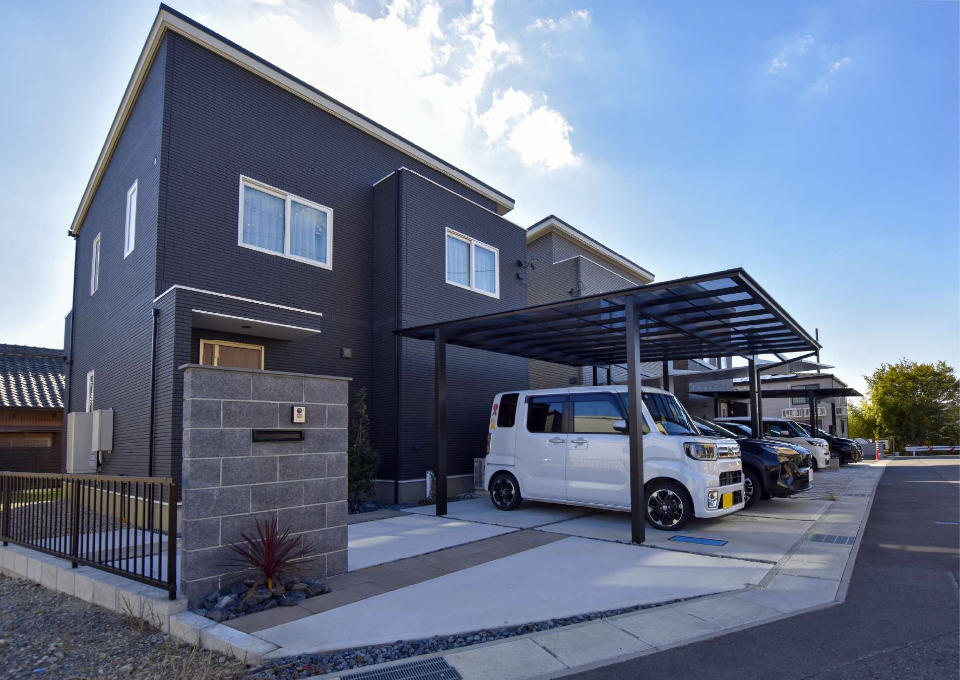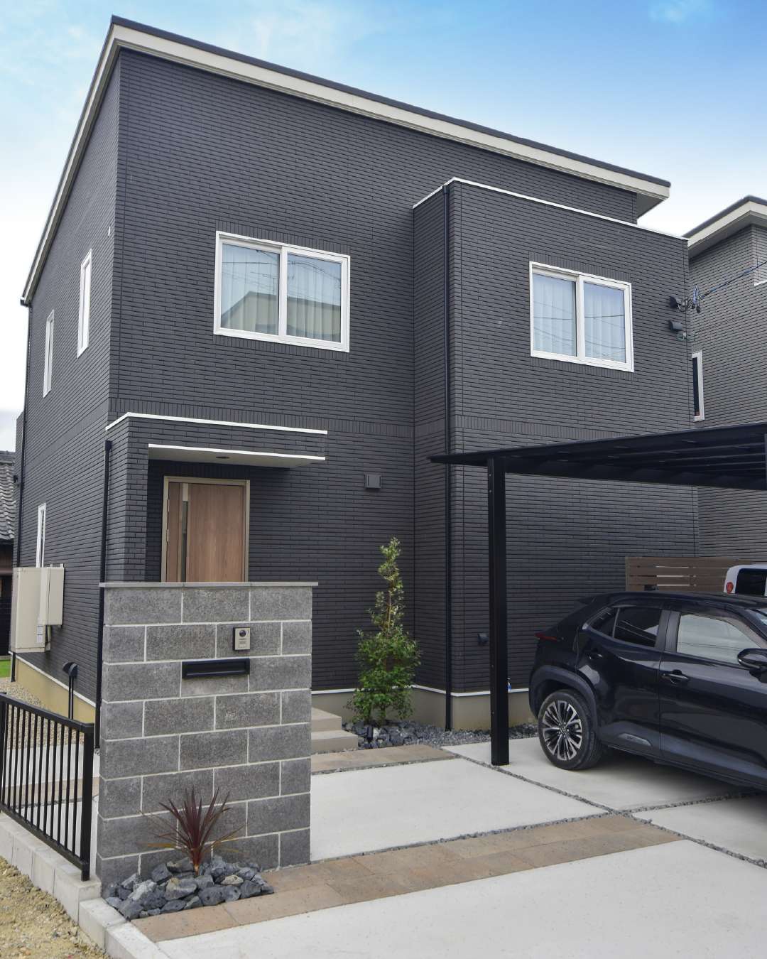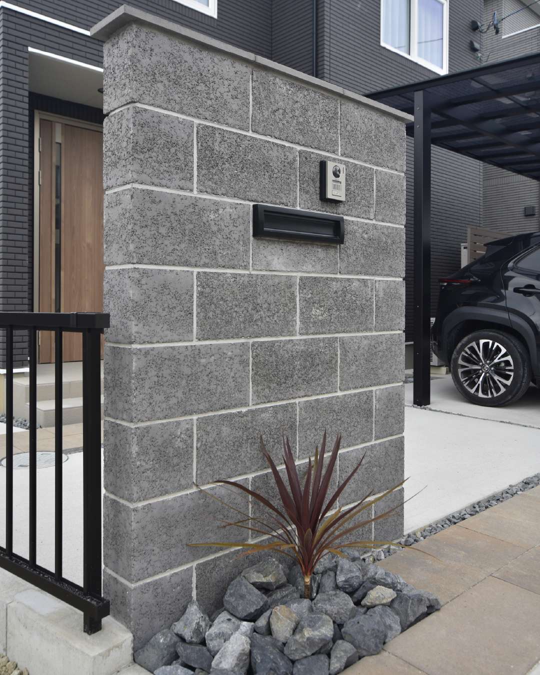 カースペースから玄関へと続くアプローチに、デザインペイブと砕石のラインをレイアウトし、空間にリズムとメリハリをプラスしました。